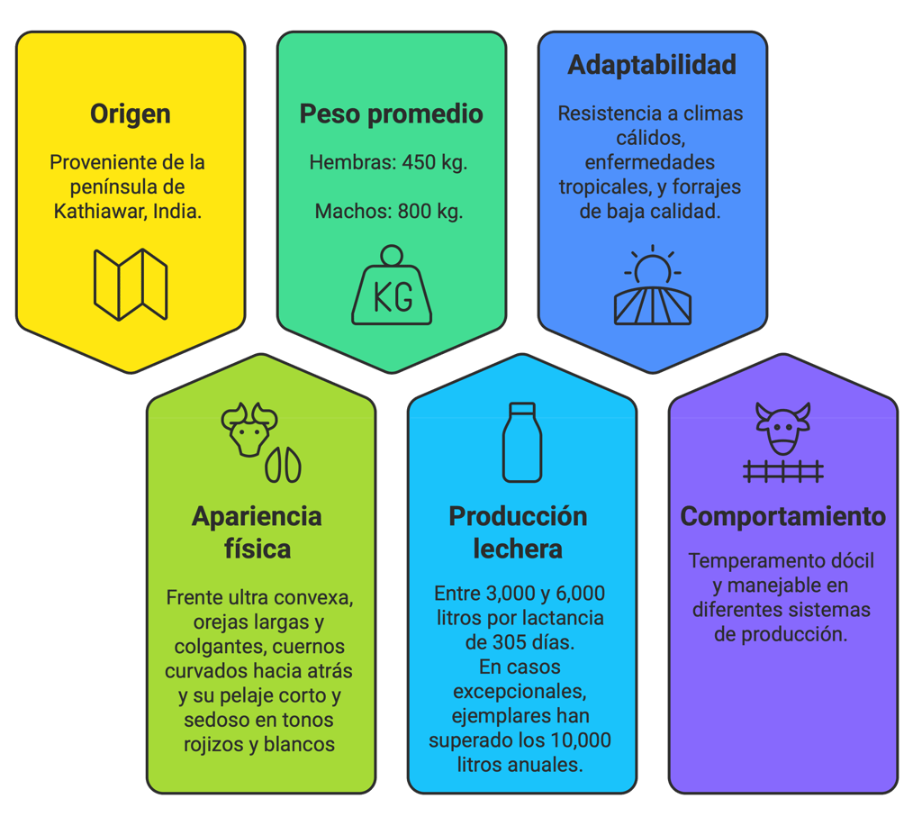 Origen: Proveniente de la península de Kathiawar en la India, reconocida por su adaptación a climas tropicales.